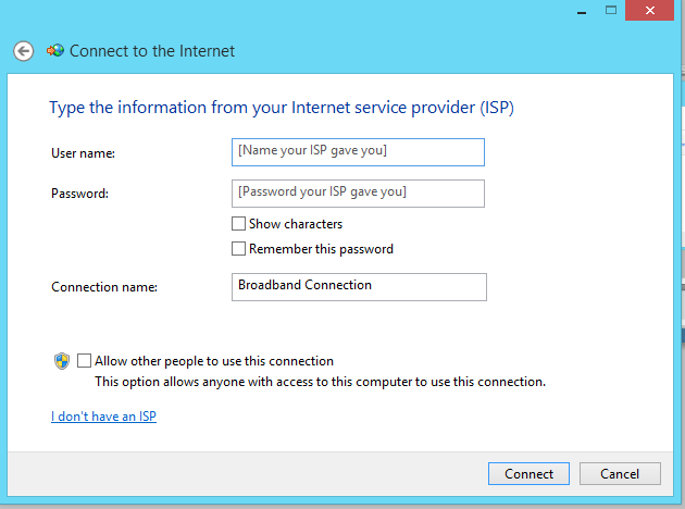 Step 7: Fill out the User name and password(provided by On-Ramp Indiana). Name the Connection “ORI Internet”, click “Connect“